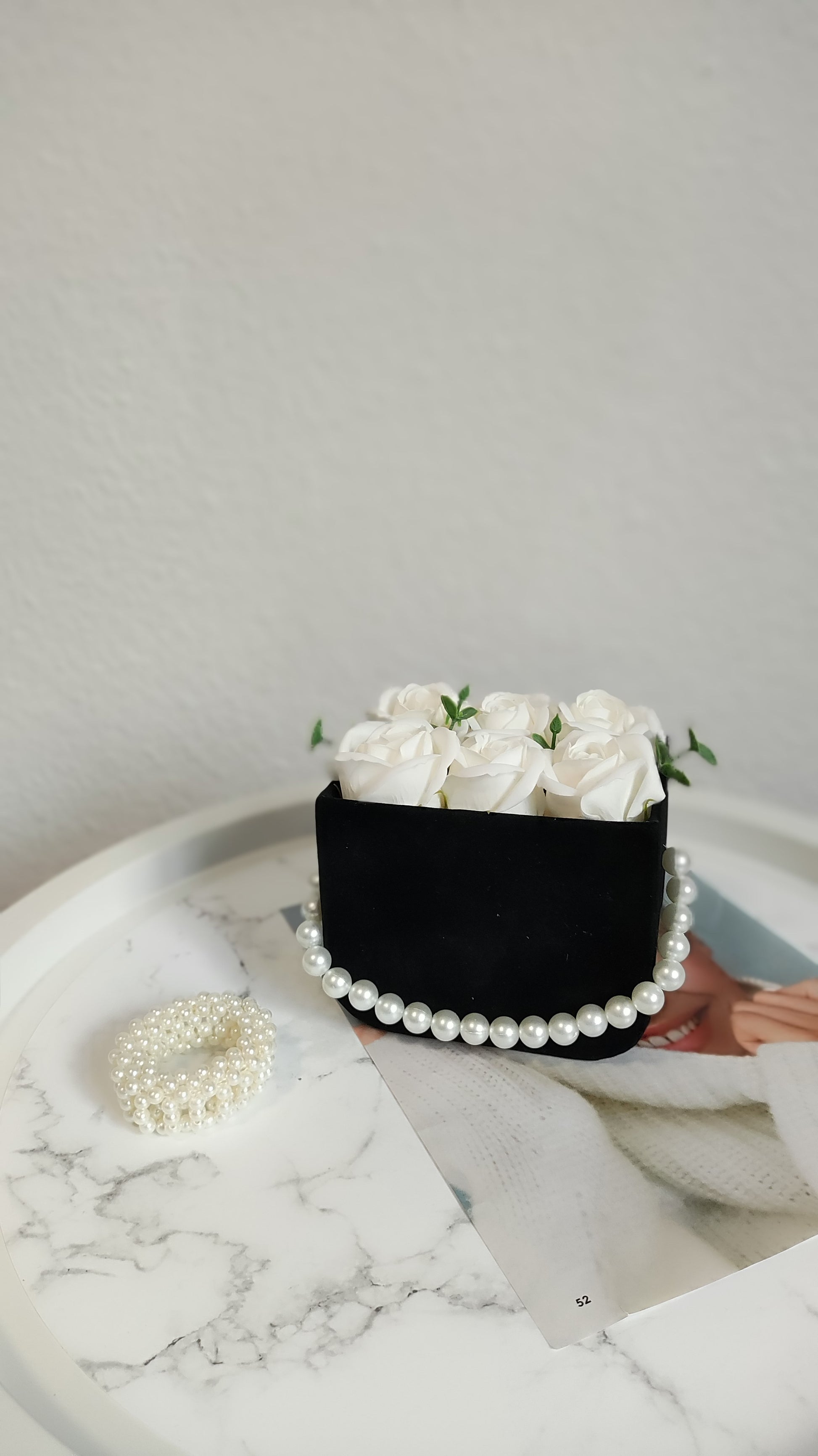 Die matte schwarze Premium-Box mit dekorativer Perlenverzierung schafft einen stilvollen Kontrast zum strahlenden Weiß der Rosen. Mini Ivory Pearl ist minimalistisch, hochwertig und zeitlos – perfekt als kleine Aufmerksamkeit mit großer Wirkung.