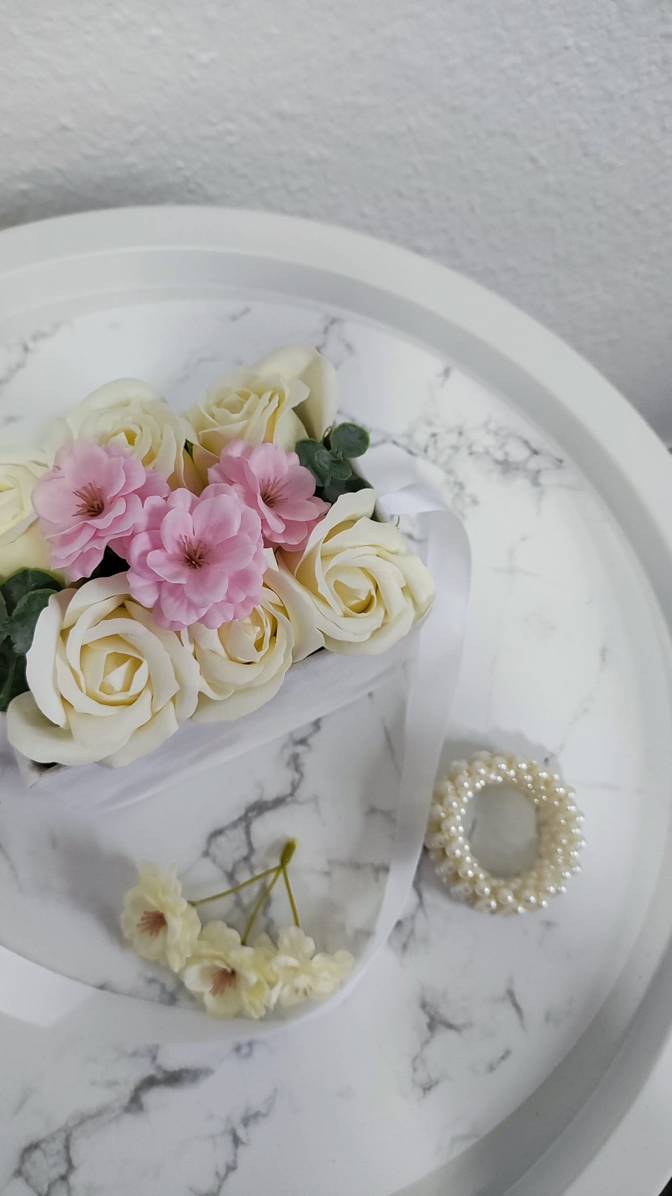 - Material: Seifenrosen, Kunstkirschblüten, Eukalyptus/Grünakzente, Samtbox